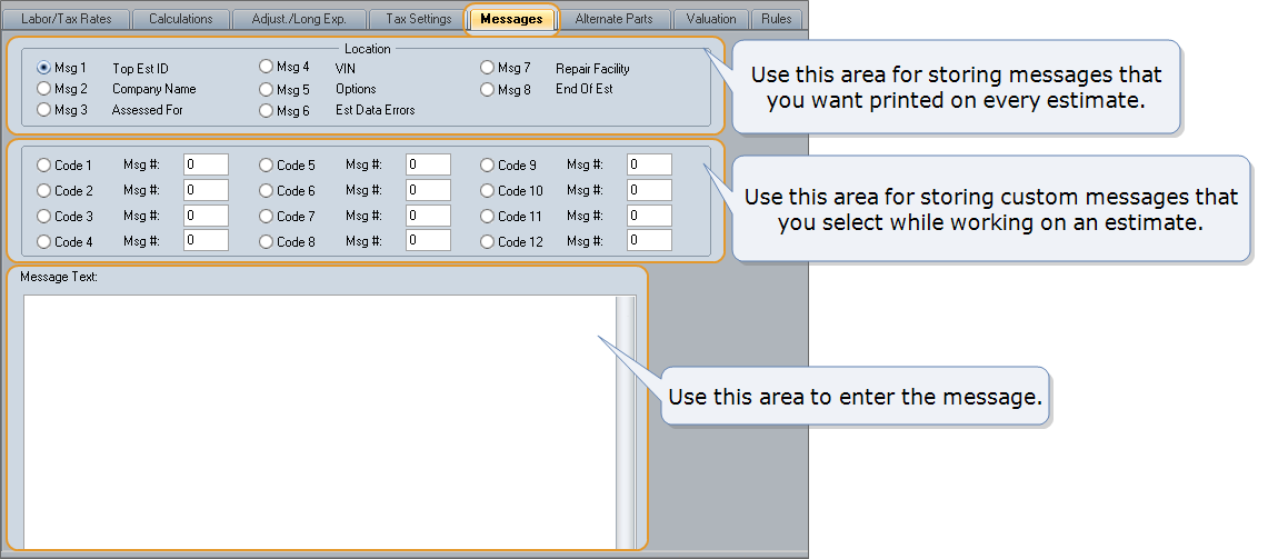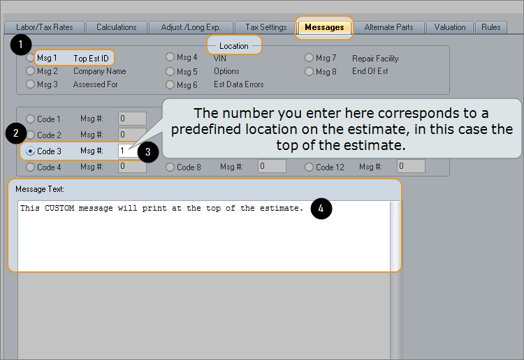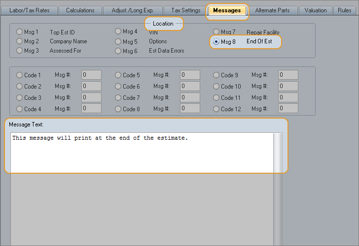 - Use the Location area of the tab (Msg 1 – Msg 8) for storing messages that you want printed on every estimate.