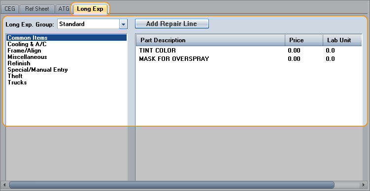 Mitchell Estimating includes a customizable database called Long Expansions. The Standard long expansion list is loaded during product installation. You can use long expansions to define estimate items specific to your business.