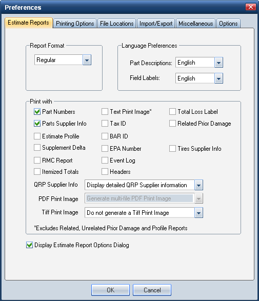 Use the Preferences dialog box to enter settings for certain features and functionality throughout Mitchell Estimating.- Estimate Reports