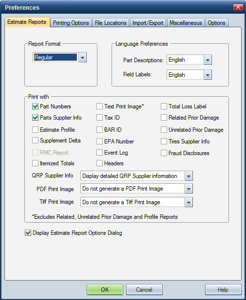- On the Estimate Reports tab, under Language Preferences, select your language preference in the Part Description and Field Label fields.
