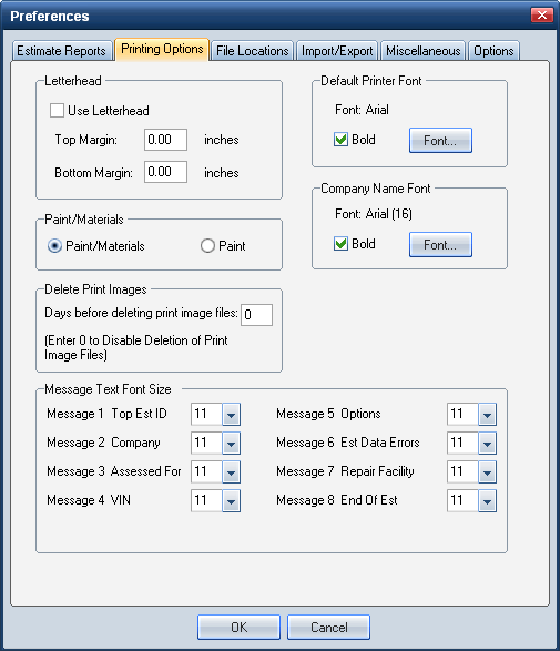 Days Before Deleting Print Image Files: (Enter 0 to Disable Deletion of Print Image Files) | The number of days (0–999) that image files can remain in the IMAGE directory. After the specified number of days, Mitchell Estimating deletes the out-of-date files at startup. Files deleted include: .est, .prn, .sup, .tif, .pdf, and .app. Note: The default is 0 days (image files are never deleted). |