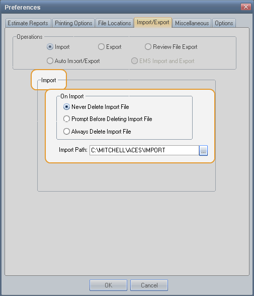 Import Path | Identify the directory where files to be imported are located. The default is C:\MITCHELL\ACES\IMPORT. |