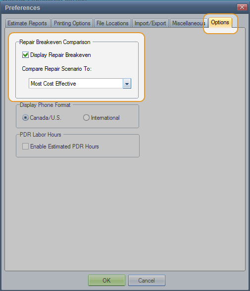 Use the Options preferences tab to configure the Part Detail dialog box to show or hide Repair Breakeven information.