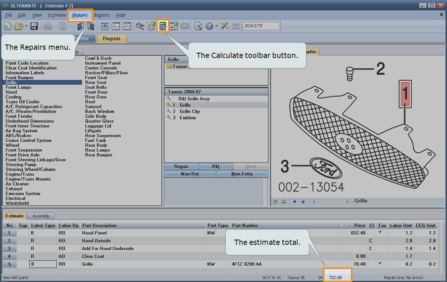 You can see the estimate total in the status bar (lower right) of the estimate. The total reflects the repair line information as it comes from the collision estimating database. It includes Procedure Page information when the estimate is calculated. You need to calculate the estimate whenever a change that affects the total is made (for example, adding, deleting, modifying a repair line, modifying the profile, or changing the deductible amount).