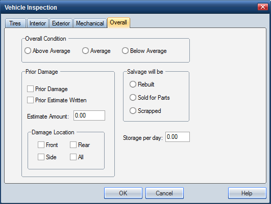 Use the Overall tab on the Vehicle Inspection dialog box to enter information about the overall condition of the vehicle.