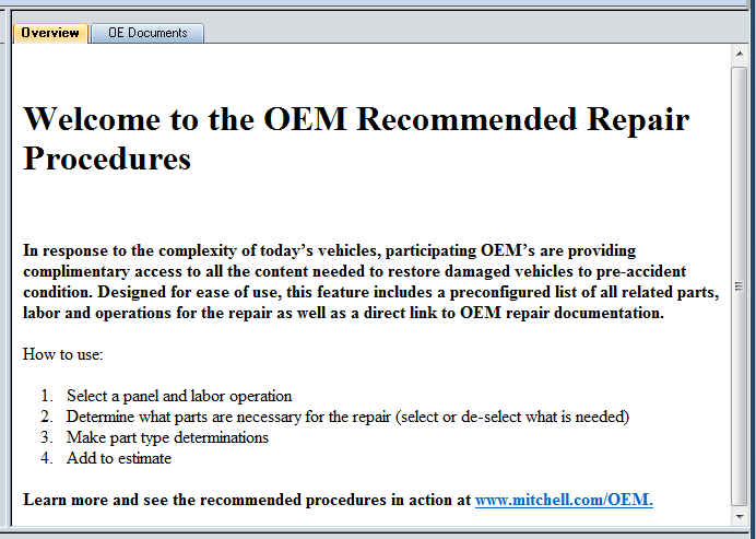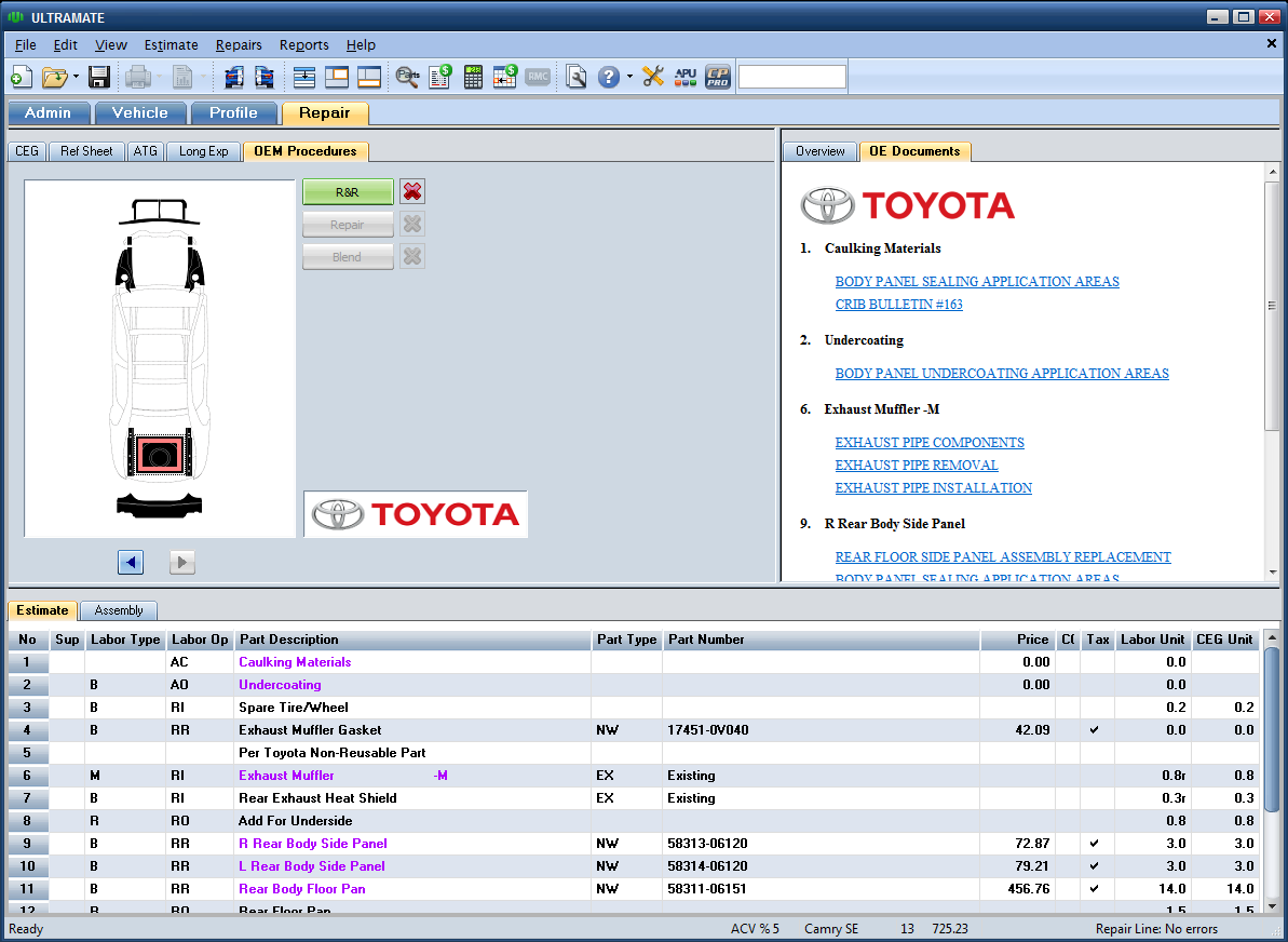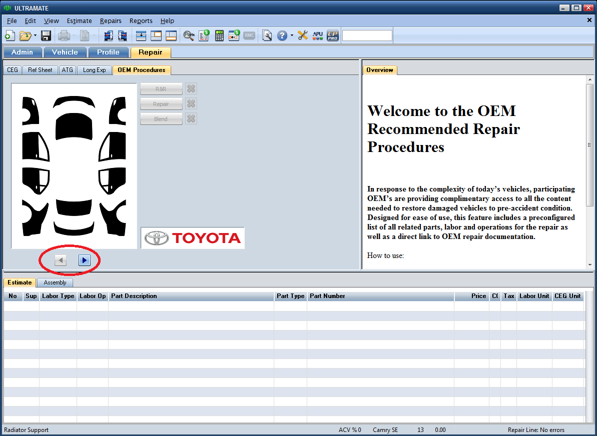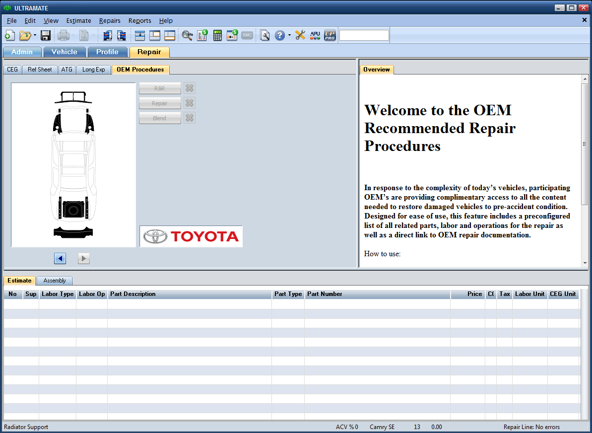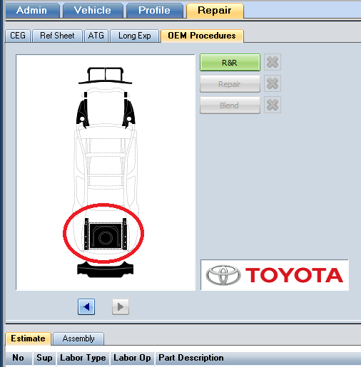 Use the OEM Procedures tab to add OEM-recommended repair lines for major panels to an estimate.At this time, OEM Templates are available for Toyota and BMW only.