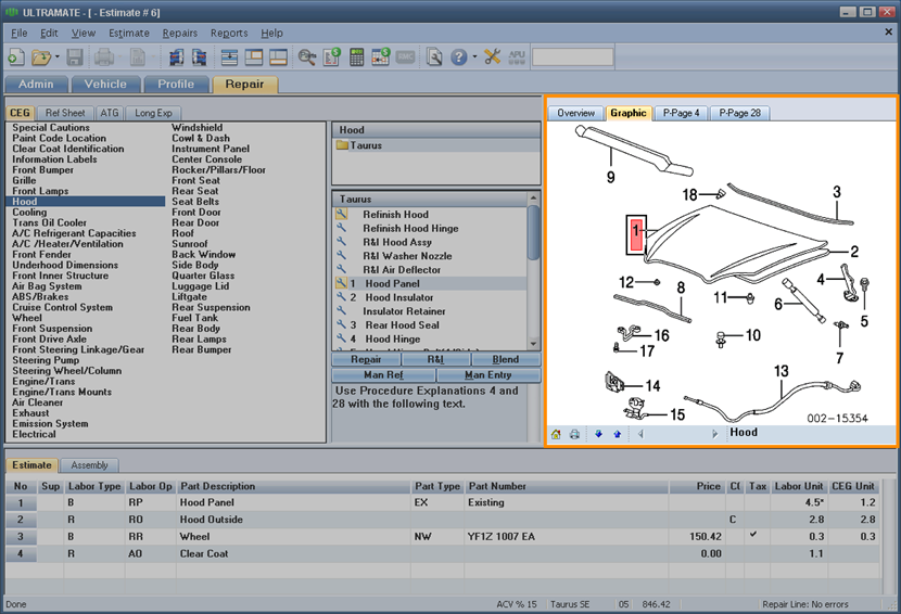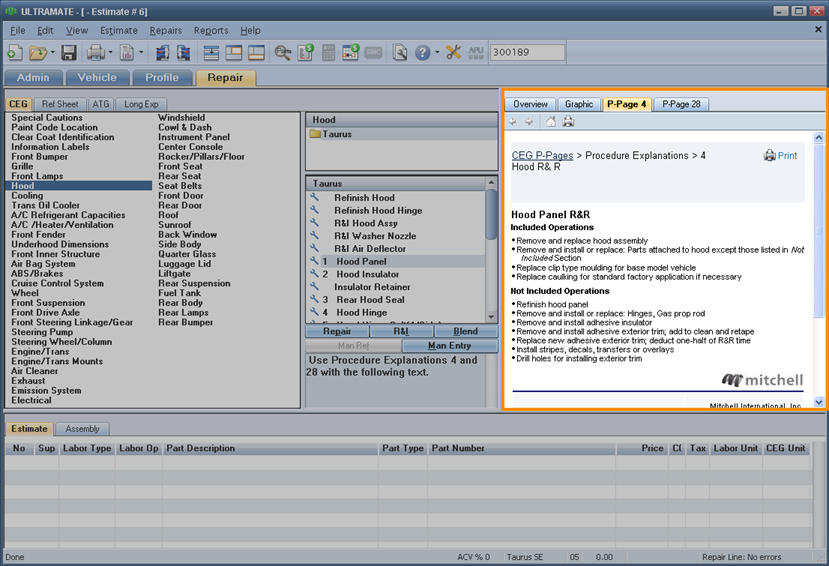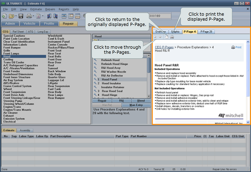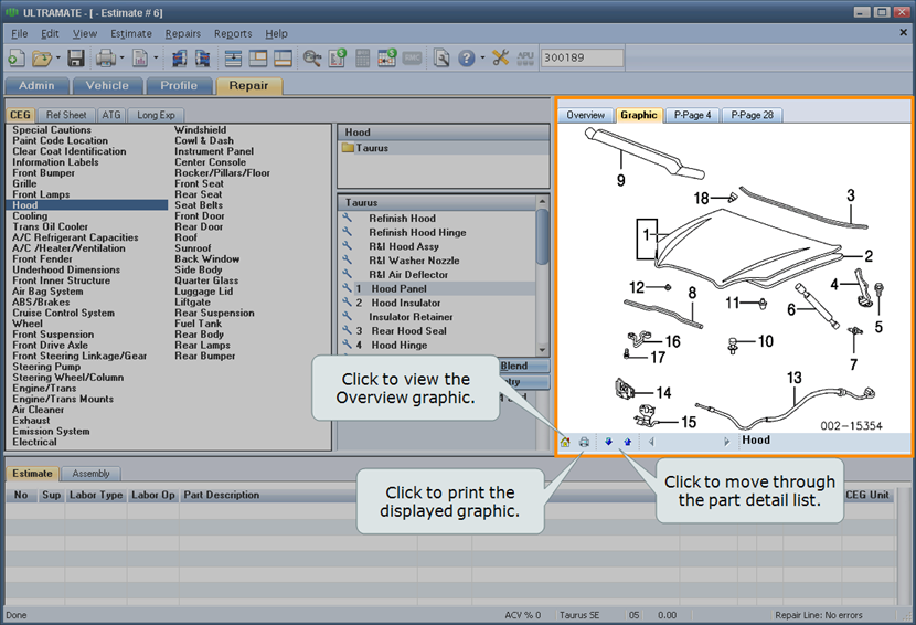 Use the image window on the Repair tab to view a graphic of a part selected in the part list. You can also view the P-Pages for a selected part, add a part to the repair lines, view an Overview image of the vehicle, and navigate the part list from the Overview image.