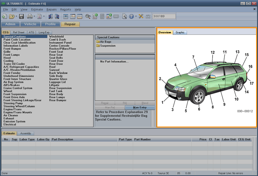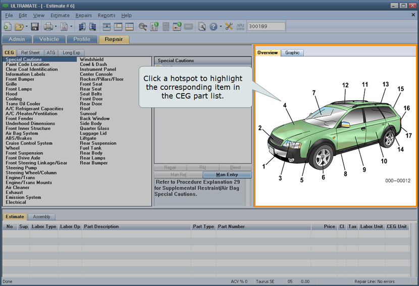 The Overview tab displays a graphic of the whole vehicle with hot spots for the major vehicle components that link to the part list. Hot spots for components with one or more parts already in the repair lines are shaded red.