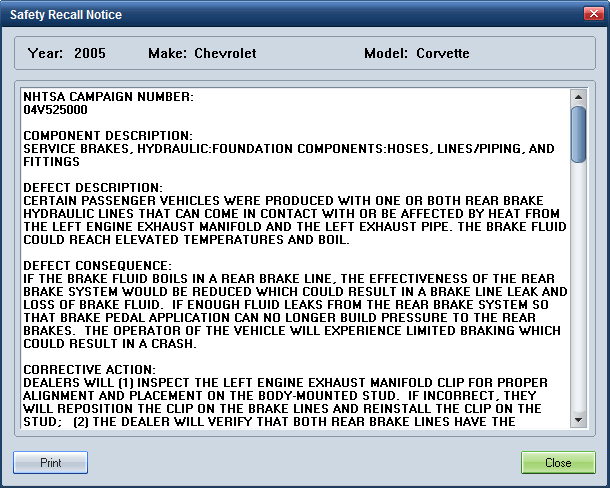 When you open the estimate for a vehicle that has received a Safety Recall Notices, the notice automatically appears. The notice contains defect information, including the required repairs.