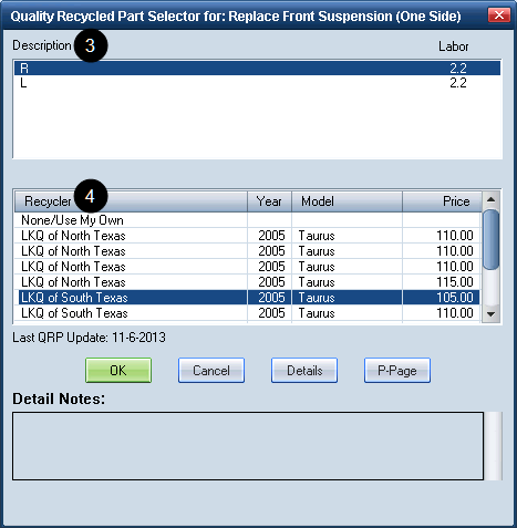 When QRP is installed, the Quality Recycled Part Selector dialog box appears when you select an assembly from the ATG parts list. This dialog box also appears when you select a labor operation that has additional details (for example, markup or explanation lines).