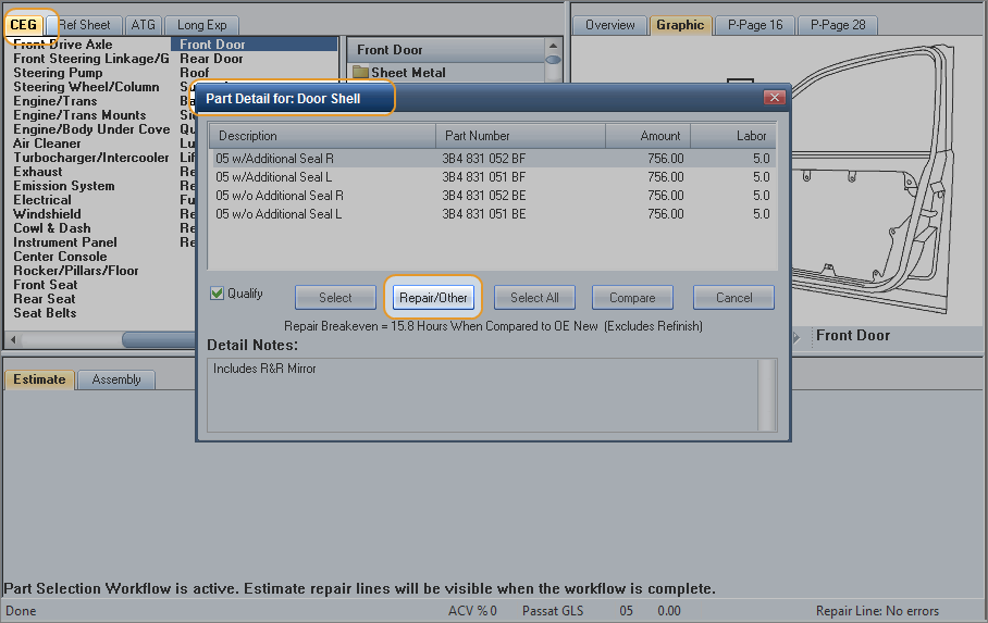 - On the CEG parts list, select a major exterior panel that includes R&I operations in its subfolders.