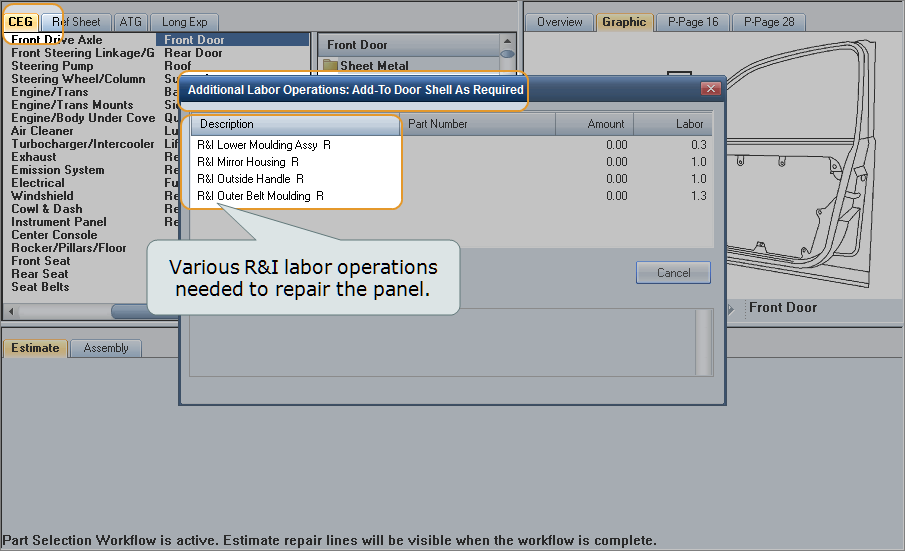 When you select a major exterior panel for repair (one that includes R&I operations), the system displays a list of all the applicable R&I labor operations. You can select what you need and add them to the repair lines all at once.