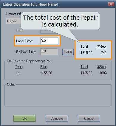 Use the Labor Operation dialog box to enter repair information and compare it to the cost of a replacement part.