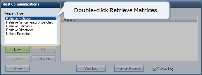 On the Host Communication dialog box, in the Request Type list, double-click Retrieve Matrices.