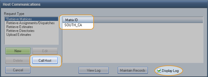 - On the Host Communication dialog box, click Call Host. When the matrix is downloaded, the View Log dialog box appears.