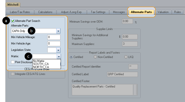 Use Mitchell's Alternate Parts Program (MAPP) to automatically include non-OEM parts (alternate parts) in your estimates. Alternate parts include Alternate New, Remanufactured, and OE Discount parts, as well as Recored, Remanufactured, Rechromed, and alternatives to OEM parts.