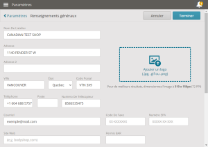 - Pour mettre à jour les renseignements généraux sur un atelier, entrez les renseignements appropriés dans les champs suivants : Nom de l'atelier, Adresse, Téléphone, Courriel, Site Web, Code de taxe, Numéro EPA, . Vous pouvez également définir les heures d’ouverture d’un atelier.