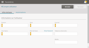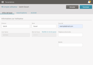 - Saisissez les informations relatives à l’utilisateur dans les champs suivants : Prénom, Nom de famille, Courriel, Nom d’utilisateur, et Numéros de téléphone.