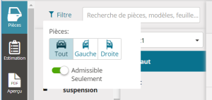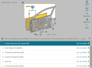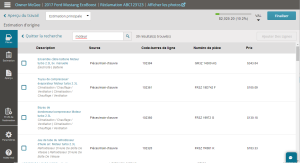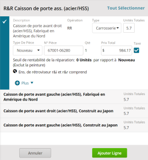 Utilisez l’onglet Pièces de la page Éditeur d’estimation pour ajouter des pièces et de la main-d’œuvre (lignes de réparation) en vue de rédiger l’estimation.
