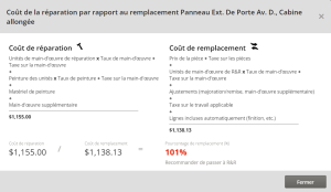 Dans la section du calcul de pourcentage de remplacement, le lien Afficher les détails ouvre la fenêtre Coût de réparation versus de remplacement. Vous pouvez voir ici l’analyse détaillée d’une réparation. Cela affiche le détail pour les équations de réparation et de remplacement à partir duquel dérive le pourcentage de remplacement.
