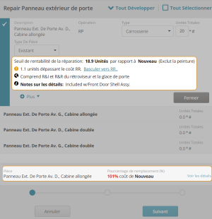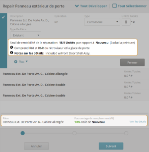 Vous trouverez sous les pièces disponibles et leurs détails le calcul du pourcentage de remplacement pour la pièce en réparation. Cette section fournit à l’utilisateur le pourcentage actuel du coût de la réparation jusqu’à ce que celui-ci atteigne ou dépasse le coût d’une nouvelle pièce de remplacement. Cette section n’est disponible que lorsque l’opération Réparer est choisie.
