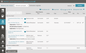 pour afficher les lignes de réparation dans l’estimation, ainsi que des informations sur les pièces et les opérations connexes. - Sélectionnez la ligne de réparation que vous voulez modifier. Vous pouvez apporter des modifications aux champs suivants :