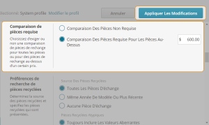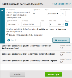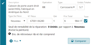 Si vous êtes un utilisateur disposant d’un Profil de pièces alternatives vous pouvez rédiger une estimation avec des pièces alternatives dans Mitchell Cloud Estimating. Comparez les profils de pièces alternatives et leurs options (y compris les pièces similaires ou recyclées) à l’aide du flux de travail Comparer les pièces alternatives.
