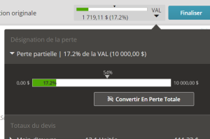 - Cliquez sur Convertir en perte totale dans la section Désignation de la perte pour désigner le véhicule comme une perte totale dans l’estimation.