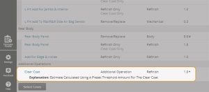 - In the estimate editor add the repair lines. The system consolidates the entire clear coat labor units into a single line taking into consideration the overlap rules. The clear coat value will be calculated as usual until the estimate max value is reached.