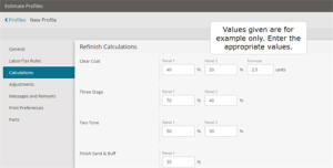 - In the Refinish Calculations section, review the default percentages for the refinish items and edit them if necessary.